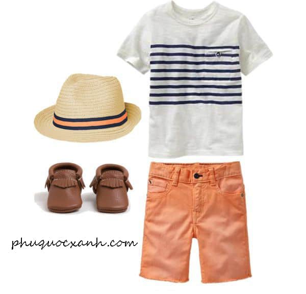 Với bộ trang phục này, thích hợp cho bé mặc khi du lịch các địa điểm nổi tiếng. Như nông trại hồ tiêu xanh Phú Quốc, nhà máy nước mắm, vườn hoa sim, trang trại ong. Cũng như là vui chơi vinpearlland thả ga. Hay đến vinpearl Safari Phú Quốc xem động vật hoang dã cùng chụp hình trong những khu vườn xinh đẹp. Áo thun trắng sọc xanh hút mồ hôi. Quần short màu san hô cùng nón mây tròn. Thêm đôi giày nâu thì tuyệt vời.