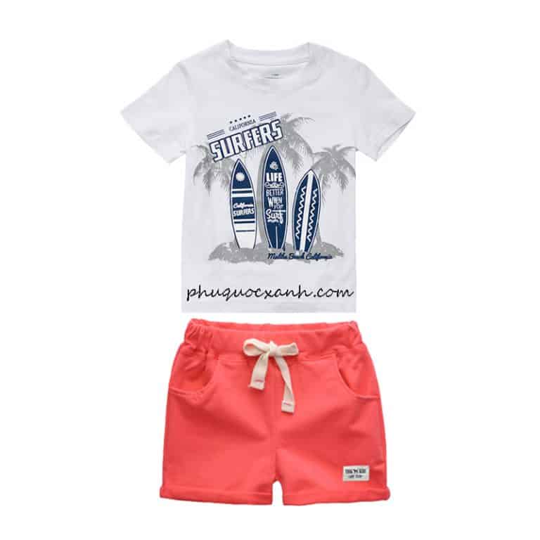 Những bé trai nào ngại mặc quần bơi khi đi du lịch ở Phú Quốc. Các bố mẹ có thể cho bé mặc áo thun bé thích. Ví dụ như bộ đồ này có áo thun trắng in hình mùa hè. Cùng chiếc quần thun ngắn màu san hô cực đẹp. Tắm biển, dạo biển, vui chơi trên biển đều được. Nhớ là đừng quên chụp cho bé vài shot hình “chất lừ” nhé.