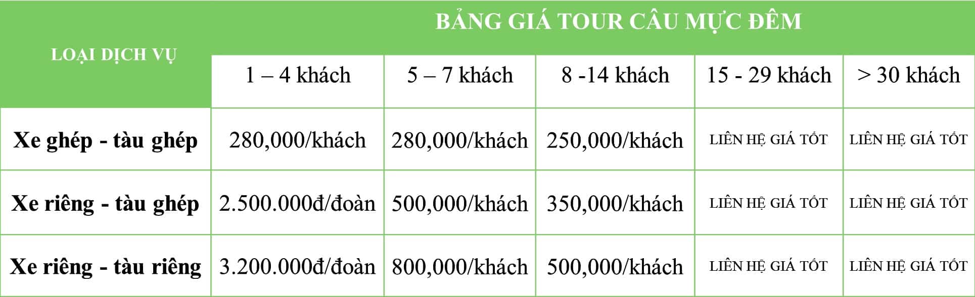 Nếu hành khách và khách du lịch bè, gia đình quan tâm đến hoạt động câu cá Phú Quốc mực đêm Phú Quốc trong dịp lễ 2/9 này. Có 2 cách để khách tham quan chọn lựa. Một là chọn đặt tour câu mực ngắm hoàng hôn của Công ty lữ hành Phú Quốc Xanh hoặc thuê tàu riêng đi câu cá Phú Quốc mực. Nếu chọn đi tour ghép đoàn thì thời gian sẽ bắt đầu từ 17h hàng ngày. Khi màn đêm huyền diệu bao trùm lấy biển Phú Quốc. Le lói ánh sáng của những con tàu bắt đầu lên đèn cho chuyến câu cá mực đầy hi vọng bội thu. Nếu các bạn đặt tour sớm thì giá chỉ từ 280.000 đồng cho 1-4 khách. Khách tham quan có thể khám phá bảng giá sau đây.