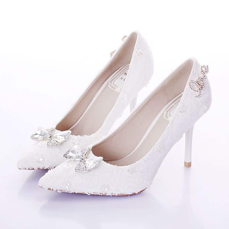 Nếu mặc váy cưới ngắn, lộ chân thì có thể chọn những đôi cao gót bít mũi không quá cao. Độ cao của gót giày chỉ nên dao động 3-7cm để cho cô dâu dễ di chuyển và tạo dáng hơn.