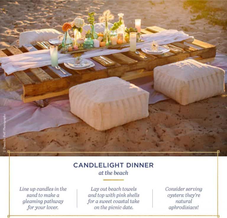 Là địa điểm cho bữa tối lãng mạn như trong phim của mọi cô gái. Nơi chụp album cưới kèm ăn tối bên bờ biển là rất phổ biến. Còn gì tuyệt vời hơn là cùng nhau ngắm mặt trời lặn. Du khách có thể set up một con đường dẫn đến bàn tiệc với nến và vỏ sò. Hải sản, hàu, bơ là những nguyên liệu tươi ngon cho một bữa ăn đêm khó quên tại bờ biển.