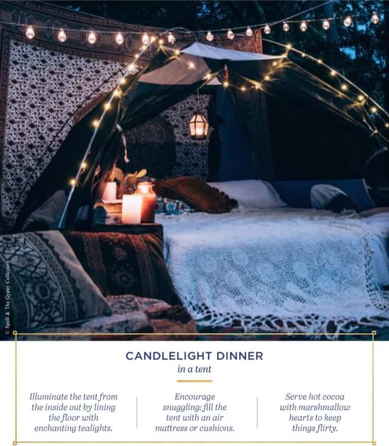 Ẳn tối lãng mạn trong lều là ý tưởng cực kỳ mới. Mang lại không gian ấm cúng với nến, chocolate và hoa hồng. Một tách trà thơm cũng rất được ưa chuộng khi ăn tối theo kiểu này.