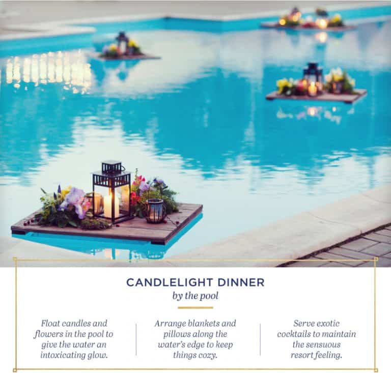 Mọi khu nghỉ mát lãng mạn tại Phú Quốc đều cung cấp bữa ăn tối bên hồ bơi cho cặp đôi. Thế nên khách tham quan hãy nắm bắt và tận dụng để có một đêm ý nghĩa nhé. Hành khách có thể yêu cầu trang trí với bất cứ chủ đề nào mà khách du lịch muốn. Cùng vài ly cocktail, rượu vang khách du lịch yêu thích.