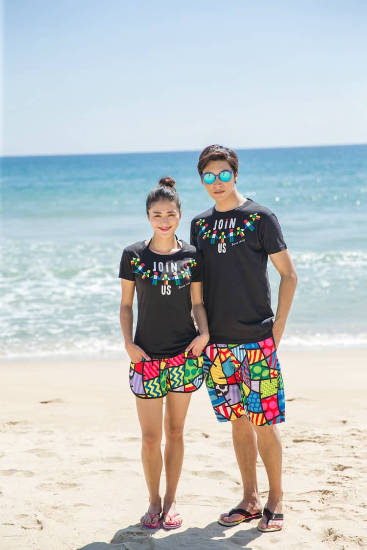 Trên nền biển xanh, cát trắng không có gì nổi “bần bật” hơn là bộ đồ đôi này. Với áo thun đen cá tính và cực ngầu. Cô dâu có thể chọn size và kiểu áo thun cho nữ để tôn dáng. Chứ không nhất thiết là chọn size áo thun nhỏ của nam. Kết hợp cùng chiếc quần short “kính vạn hoa” đầy màu sắc rực rỡ. Đủ thấy không khí mùa hè tràn ngập hình cưới. Nếu khách tham quan chọn chụp hình cưới trong mùa hè. Đây là bộ đồ đôi thích hợp. Có thể đeo thêm kính mát cho sinh động nhé. Ngoài ra, chụp hình xong còn có thể tắm biển ngay hay tham gia nhiều trò chơi dưới nước.