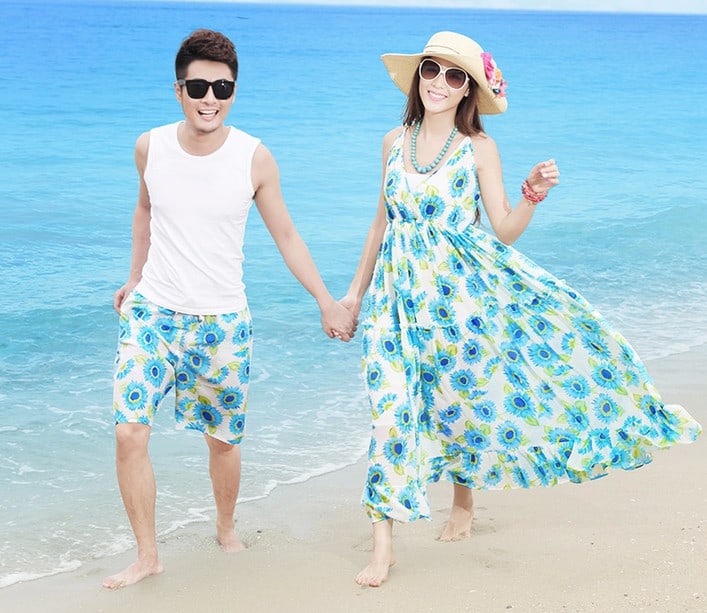 Phú Quốc là thiên đường nhiệt đới mà cô dâu không diện váy hoa nhiệt đới thì uổng phí lắm. Chú rể thì đơn giản hơn. Chỉ cần chọn quần short có họa tiết giống màu váy hoa của cô dâu. Sau đó diện thêm áo thun trắng hay áo ba lỗ trắng là được. Trang phục không cầu kỳ nhưng xinh đẹp. Lên hình ăn ảnh và cực nổi bật với phong cách tạo dáng ngẫu nhiên.