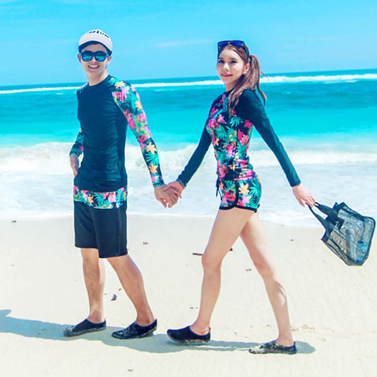 Không khó để tìm một bộ bikini cho nữ và quần short cho nam cùng tông với nhau. Thích hợp để chụp ảnh cưới Phú Quốctại biển hay hồ bơi. Đơn giản là bạn chỉ cần chọn họa tiết trên trang phục bơi mà mình yêu thích. Về khoản này thì cô dâu chọn thế nào đảm bảo chú rể cũng sẽ chọn thế ấy. Có thể kết hợp thêm áo khoác thun có nón hay nón lưỡi trai nếu chụp dưới trời nắng. Mà không cần phải tạo dáng rườm rà như khi mặc váy cưới và âu phục.