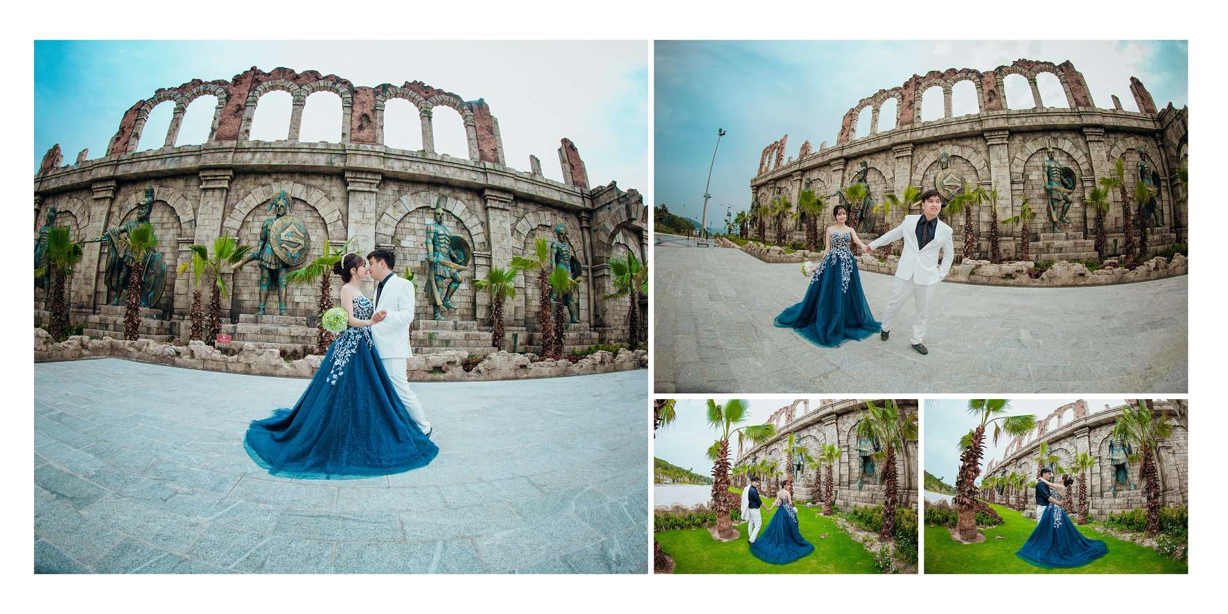 Những bức tường gạch mang đậm tính chất thời trung cổ, những bức tượng chiến binh uy nghi lạnh lùng. Thêm nền cỏ xanh mướt là background hoàn hảo cho bộ ảnh cưới tại đảo Phú Quốc.