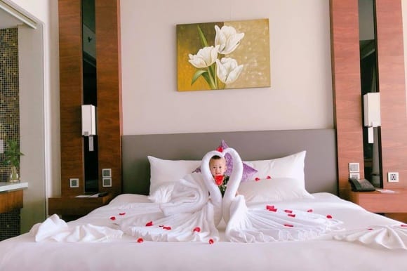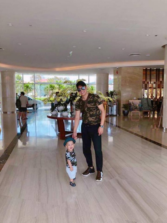 Nam diễn viên cùng con trai tại một resort sang chảnh của Phú Quốc. Dù con trai hay quấy khóc nhưng khá vui vẻ khi được du lịch Phú Quốc cùng bố mẹ.