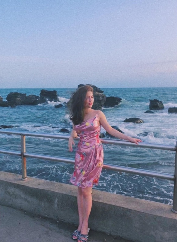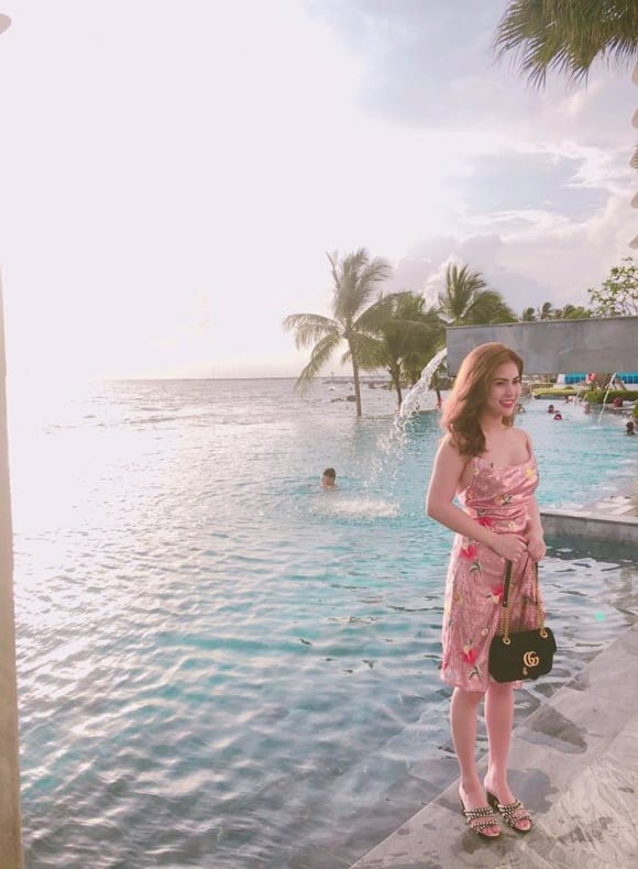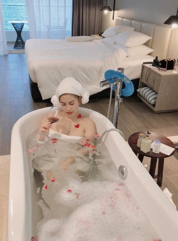Hương Trần khoe dáng tại biển Phú Quốc. Cô từng đăng status ẩn ý cảnh cáo Quế Vân. Sau khi những hình ảnh chồng cô lau nước mắt cho Quế Vân trong quán cà phê xuất hiện.