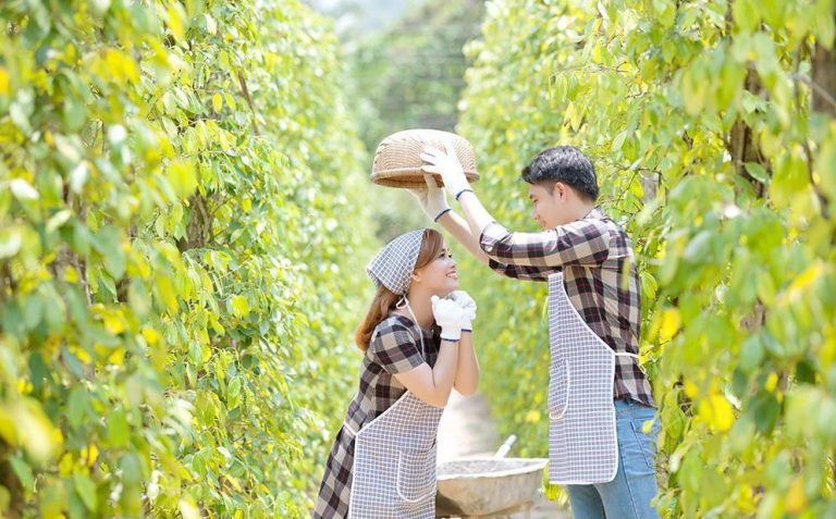 Được mệnh danh là “vương quốc hồ tiêu”, Phú Quốc được xem là cơ sở trồng và sản xuất tiêu lớn nhất vùng Đồng bằng sông Cửu Long, đến đây khách tham quan sẽ phải trầm trồ lên trước những cơ sở trồng và sản xuất tiêu xanh mướt, những chùm tiêu chín mọng trên cành. Chắc chắn đây sẽ là địa điểm chụp ảnh cưới trên đảo Ngọc mà không cặp đôi nào có thể bỏ qua trong tour Phú Quốc kết hợp chụp album cưới của mình.